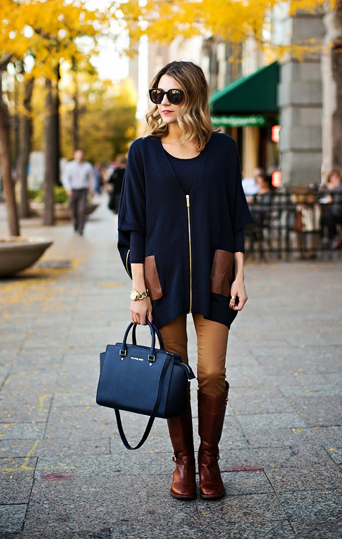 I love the classic color combination of navy, cognac, and gold. Something about the combo seems timeless and sophisticated.  I've been anxious to get a poncho for Fall. I was immediately drawn to the detailing on this one with the faux leather pockets and gold zippers on the side.